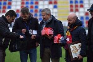 Nel pre match le due delegazioni si sono scambiate in campo strette di mano, sorrisi e doni, a sancire un legame prezioso e importante. Scambio che ha coinvolto anche la società rossoblù, che ha ricambiato regalando gagliardetto ed il PanetTorres griffato Rau agli avversari.