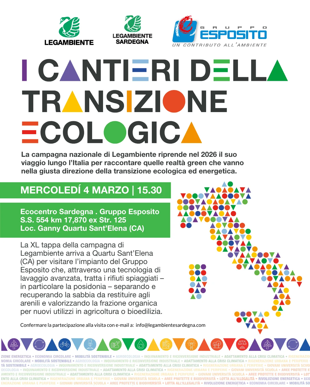 Dopodomani, mercoledì 4 marzo la campagna “I cantieri della transizione ecologica” di Legambiente farà tappa in Sardegna, a Quartu Sant’Elena, nella Città metropolitana di Cagliari. La 40ª tappa sarà dedicata al trattamento e recupero di rifiuti spiaggiati (in particolare la posidonia) tramite un processo che, tramite una particolare tecnologia di lavaggio, tratta i rifiuti spiaggiati per recuperare ogni granello di sabbia da restituire alla spiaggia d’origine e per valorizzare la frazione organica presente, rendendola idonea all’utilizzo in agricoltura o in bioedilizia. Il programma prevede, alle ore 15.30, la visita all’impianto di Ecocentro Sardegna, società del Gruppo Esposito.