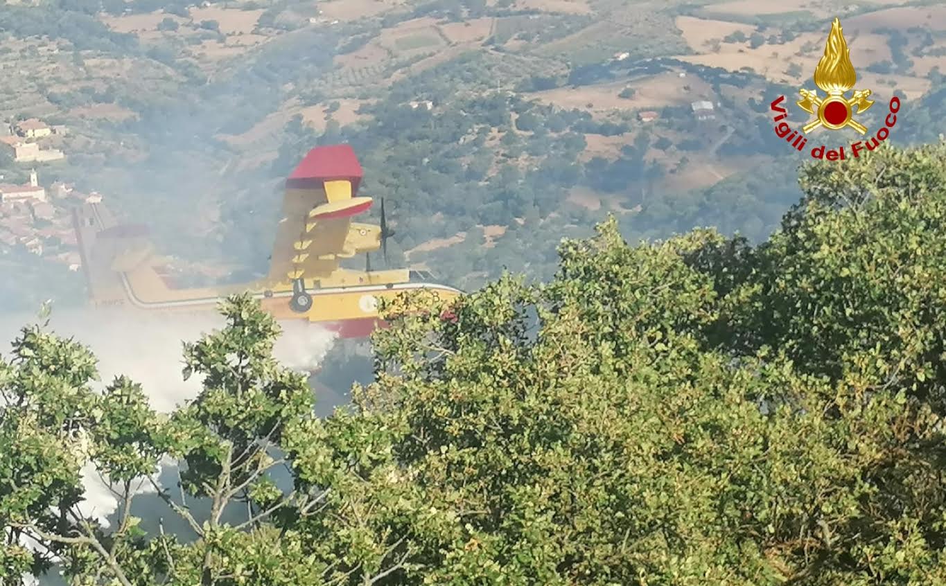 Due squadre di vigili del fuoco, due canadair ed alcuni elicotteri della Corpo forestale sono in azione per spegnere un incendio boschivo a ridosso dell’abitato di Burgos.