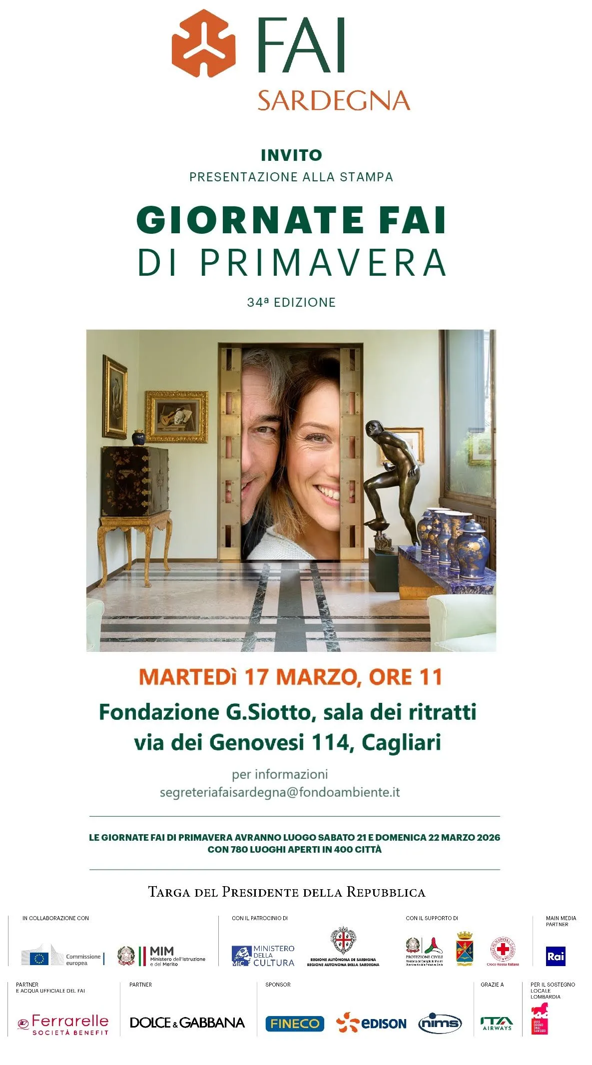 Martedì 17 marzo la Direzione Regionale del FAI Sardegna presenterà alla stampa le iniziative locali delle Giornate FAI di Primavera, in programma su tutto il territorio nazionale sabato 21 e domenica 22 marzo 2026, con visite a contributo libero in 780 luoghi in tutta Italia.