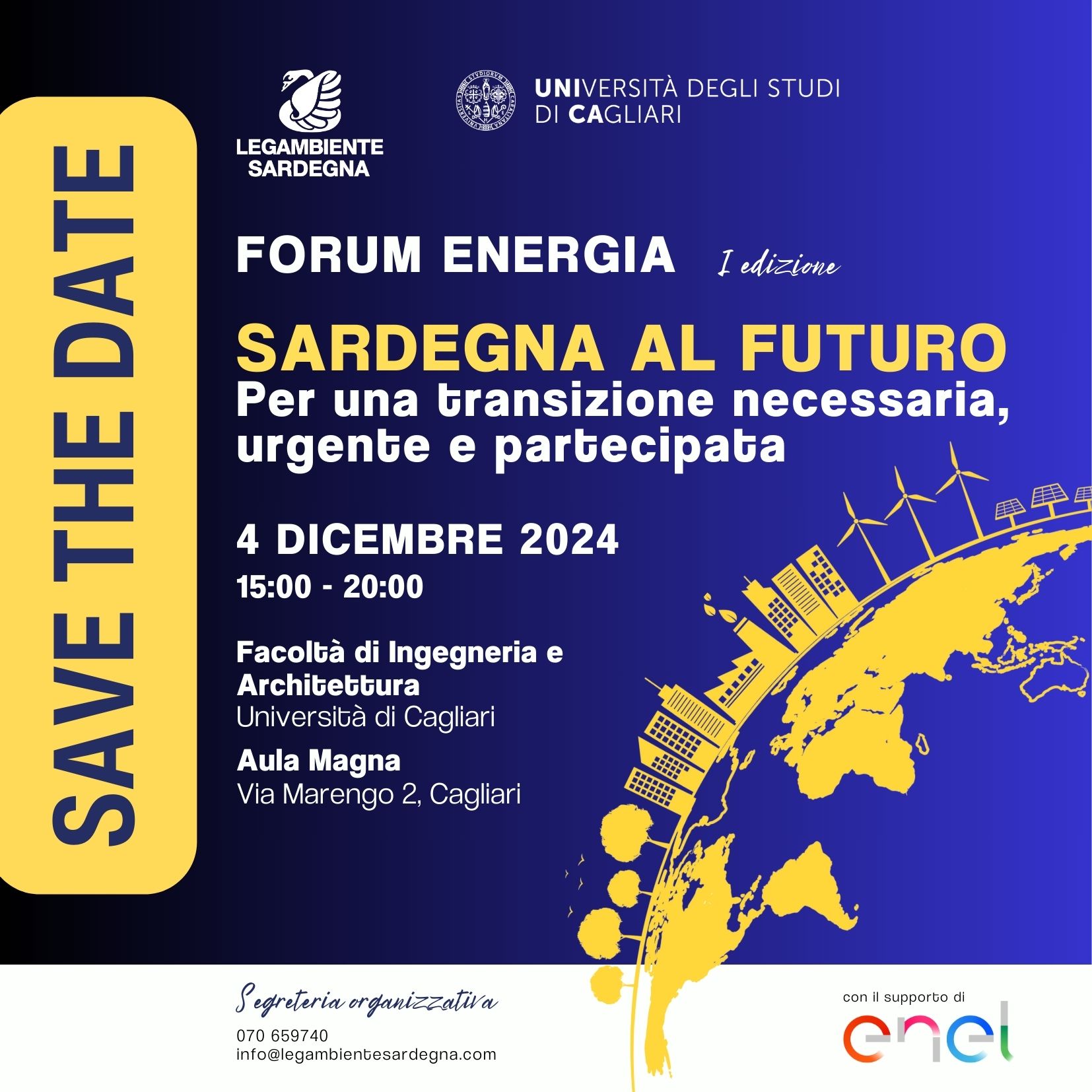 Se ne parlerà mercoledì 4 dicembre, dalle 15.00, presso l’Aula Magna del Campus di Ingegneria in via Marengo 2 nel primo Forum Energia organizzato da Legambiente Sardegna in collaborazione con la Facoltà di Ingegneria e Architettura dell’Università di Cagliari. Ai lavori, che saranno coordinati dalla presidente Marta Battaglia, dalla direttrice Valentina Basciu, e dal prof. Giorgio Querzoli, responsabile Scientifico di Legambiente Sardegna, parteciperanno amministratori, tra i quali l’Assessore regionale all’industria Emanuele Cani, e l’Assessora alla difesa dell’ambiente, Rosanna Laconi; esperti del settore; rappresentanti delle associazioni, come il presidente di AERO Fulvio Mamone Capria, il presidente di ANEV Simone Togni, di ItaliaSolare Paolo Rocco Viscontini; esponenti del mondo delle aziende. É stata invitata la presidente della Regione Alessandra Todde. Concluderà i lavori il presidente nazionale di Legambiente Stefano Ciafani.