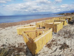 La finalità delle barriere in canna è quella di favorire l’accumulo di sabbia movimentata dal vento, limitando il deflusso delle acque a monte, e impedendo l’accesso delle persone nei tratti da rinaturalizzare. I contenitori di forma triangolare, posizionati in via sperimentale nella spiaggia di Su Crastu Biancu, hanno la funzione di ospitare e proteggere la piantagione di specie pioniere.