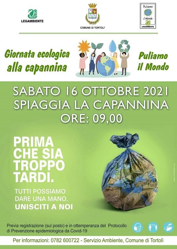 Si terrà sabato 16 ottobre, a partire dalle 9.00, una giornata ecologica che riguarderà la pulizia della della spiaggia della Capannina, a Tortolì. Il Comune amministrato dal sindaco Massimo Cannas ha aderito all’importante iniziativa promossa da Legambiente “Puliamo il mondo”, e che coinvolgerà gli alunni delle scuole medie di Tortolì e diverse associazioni.