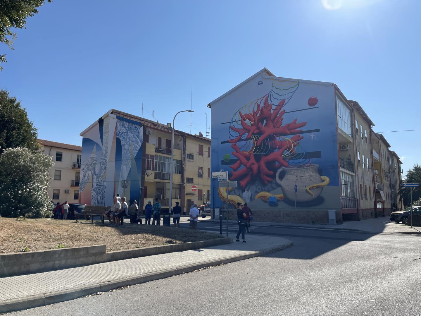 Quello di Tellas è un’opera concettuale, con i suoi tratti distintivi e i colori tenui, che in qualche modo ricorda i fondali marini, mentre quello di Luca Rancy vuole essere il simbolo della vita che nasce dentro il quartiere: un grande corallo rosso nascente, segno distintivo di Alghero, elementi marini che richiamano la natura di città che si affaccia sul mare e uno dei vasi preistorici ritrovati all’interno delle domus de janas di Cuguttu, esposto al Museo archeologico.