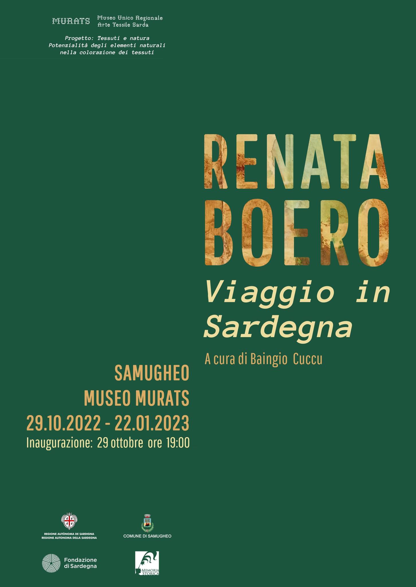 Il Murats di Samugheo ospiterà dal 29 ottobre al 22 gennaio, la mostra temporanea dal titolo Viaggio in Sardegna, realizzata dal comune di Samugheo. L’esposizione indaga le potenzialità delle tinture naturali su tela attraverso i lavori di Renata Boero, una delle figure apicali della seconda metà del 900 italiano. I lavori esposti comprendono alcune opere storiche appartenenti alla serie dei Cromogrammi e Ctoniografie mentre altri sono stati realizzati appositamente per la mostra, esito di una visione della Sardegna nata dopo un suo viaggio/sopralluogo a Samugheo.