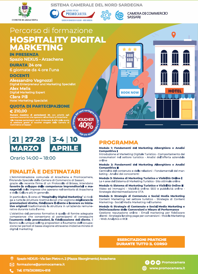 «Abbiamo dato subito concretezza al protocollo d’intesa siglato con Promocamera lo scorso ottobre. Le idee messe nero su bianco insieme all’Azienda Speciale si traducono, in prima battuta, in un calendario intenso di tre corsi formazione che rispondono alle reali esigenze delle aziende del territorio – afferma Claudia Giagoni, assessore del Turismo e del Commercio del comune di Arzachena -. Sono stati proprio gli operatori a suggerirci, in vari momenti di incontro, quali sono le tematiche di tendenza su cui vogliono prepararsi per affrontare efficacemente le sfide del mercato e cogliere nuove opportunità. I corsi su controllo di gestione, digital marketing per il settore vitivinicolo e ricettivo danno il via a una serie di iniziative in programma periodicamente ad Arzachena, in particolare nel nuovo Spazio Nexus comunale, la cui inaugurazione è prevista il 21 marzo in occasione della prima lezione. Arzachena diventa, così, punto di riferimento per la formazione delle aziende in Gallura. Su questa scia il Comune continuerà a investire accanto a tanti partner istituzionali e privati per la crescita della destinazione anche in termini di servizi offerti.»
