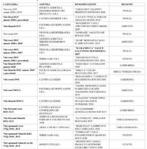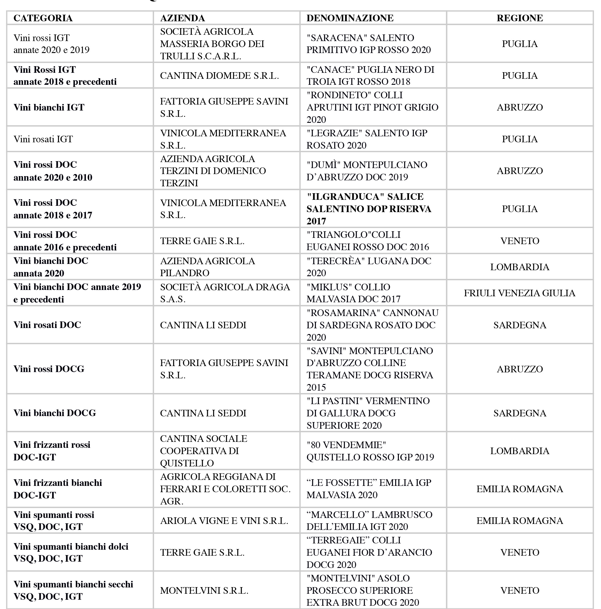 Conquistano il Premio Qualità Italia 2021: 5 vini del Veneto, 4 della Puglia, 3 vini della Sardegna e dell’Abruzzo, 2 vini della Lombardia e dell’Emilia Romagna ed 1 vino del Friuli Venezia Giulia.