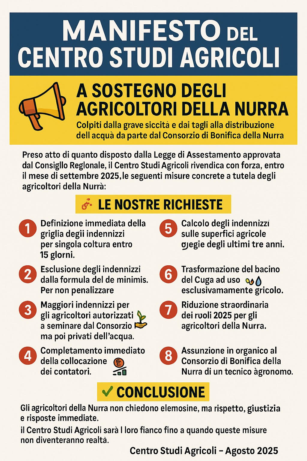 Il Centro Studi Agricoli annuncia per mercoledì 10 settembre alle ore 10.30 una manifestazione di protesta e sit-in a Sassari, davanti alla sede del Consorzio di Bonifica della Nurra in via Rolando.