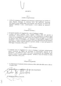 Su richiesta del presidente della Regione, Christian Solinas, al fine di contrastare e limitare la diffusione del virus in Sardegna, il ministro delle Infrastrutture e dei Trasporti, Paola De Micheli, ha firmato un decreto con il quale vengono sospesi i collegamenti e i trasporti ordinari dei passeggeri da e per la Sardegna. È consentito quindi solo il trasporto marittimo delle merci sulle navi previste in convenzione ed il trasporto marittimo delle persone può eventualmente avvenire soltanto previa autorizzazione del presidente della Regione, quale Autorità sanitaria e per dimostrate e improrogabili esigenze. Per quanto riguarda il trasporto aereo, si viaggia solo tra Roma Fiumicino e l’aeroporto di Cagliari, a patto che le ragioni dello spostamento siano dimostrate ed improrogabili, e previa autorizzazione del presidente della Regione.