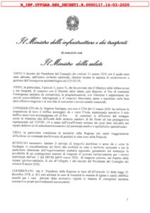 Su richiesta del presidente della Regione, Christian Solinas, al fine di contrastare e limitare la diffusione del virus in Sardegna, il ministro delle Infrastrutture e dei Trasporti, Paola De Micheli, ha firmato un decreto con il quale vengono sospesi i collegamenti e i trasporti ordinari dei passeggeri da e per la Sardegna. È consentito quindi solo il trasporto marittimo delle merci sulle navi previste in convenzione ed il trasporto marittimo delle persone può eventualmente avvenire soltanto previa autorizzazione del presidente della Regione, quale Autorità sanitaria e per dimostrate e improrogabili esigenze. Per quanto riguarda il trasporto aereo, si viaggia solo tra Roma Fiumicino e l’aeroporto di Cagliari, a patto che le ragioni dello spostamento siano dimostrate ed improrogabili, e previa autorizzazione del presidente della Regione.