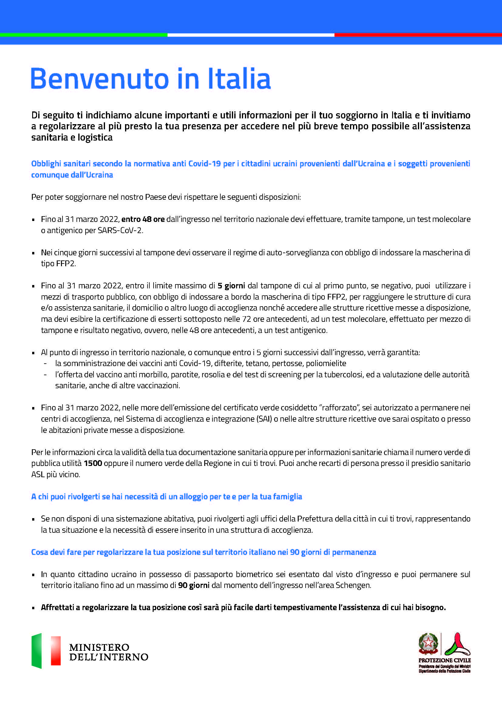 A tal fine il Dipartimento della Pubblica Sicurezza, d’intesa con la Protezione Civile della Presidenza del Consiglio dei ministri e con il ministero della Salute ha redatto un opuscolo informativo (in lingua italiana, inglese ed ucraina) recante notizie utili per consentire la regolare permeanza sul nostro territorio sia dal punto di vista del soggiorno che di quello sanitario e logistico.