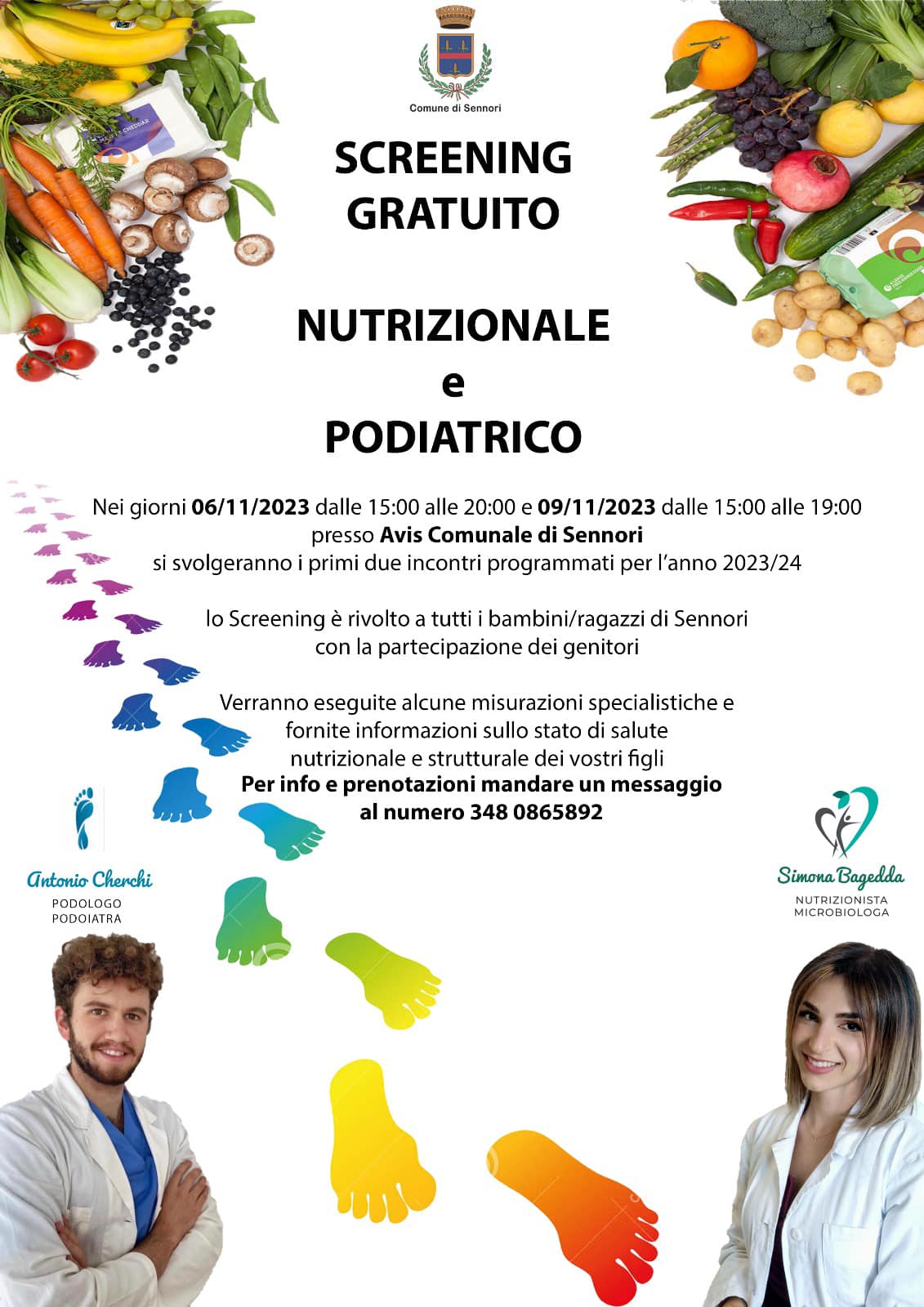 In continuità con le tante iniziative finalizzate alla prevenzione sanitaria realizzate in questi anni, gli assessorati comunali ai Servizi sociali e alla Pubblica istruzione organizzano uno screening nutrizionale e podiatrico, gratuito, rivolto ai bambini e ragazzi che frequentano l’Istituto comprensivo di Sennori, con la partecipazione dei genitori.