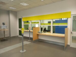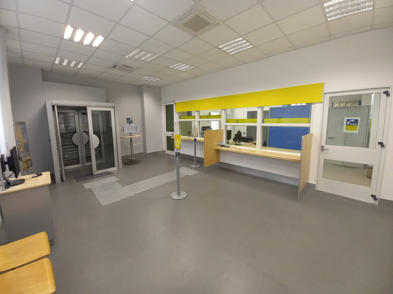 Gli interventi hanno riguardato la completa riorganizzazione degli spazi, il miglioramento del confort ambientale e laa facilitazione dell’accesso ai servizi. In quest’ottica, tra le altre opere, si inseriscono la nuova configurazione della linea di sportelleria, con altezze ribassate per agevolare tutti i segmenti di clientela e postazione di lavoro ergonomica per favorire una corretta postura, e la posa di un percorso in rilievo sul piano di calpestio per consentire alle persone con deficit visivi la piena autonomia negli spostamenti all’interno della sala al pubblico senza l’ausilio di assistenza.