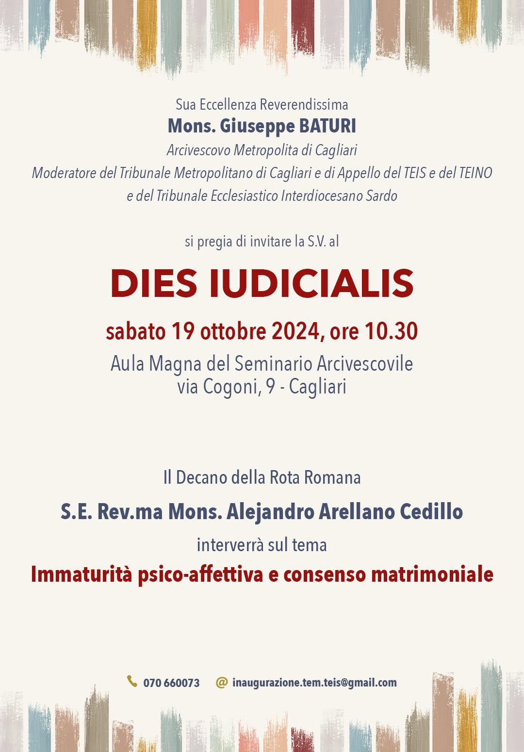 Sabato 19 ottobre, alle ore 10.30, presso l’Aula Magna del Seminario Arcivescovile (via monsignor G. Cogoni 9, Cagliari) si terrà il “Dies Iudicialis 2024”.
