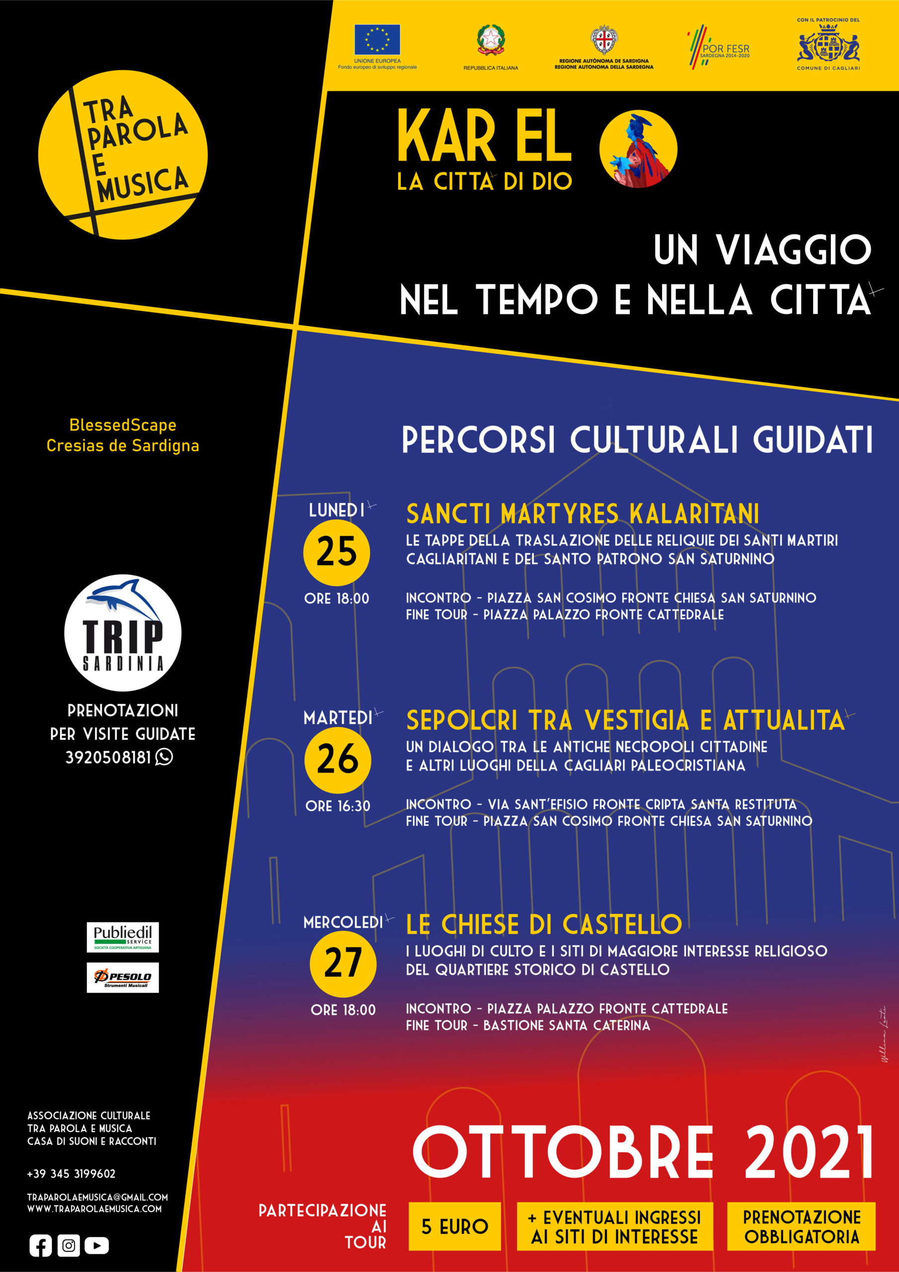 KAR EL – La Città di Dio, ideato e diretto da Andrea Congia, prodotto e organizzato dall’Associazione Culturale Tra Parola e Musica – Casa di Suoni e Racconti, prosegue il suo programma artistico divulgativo dedicato alla Storia della Chiesa Cagliaritana con tre distinti itinerari nei siti di maggiore interesse religioso del Capoluogo Isolano. Gli appuntamenti, condotti dall’Agenzia di Servizi Turistici Trip Sardinia, si snoderanno tra i Quartieri storici di Stampace, Marina, Villanova e Castello.