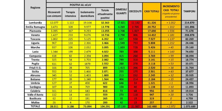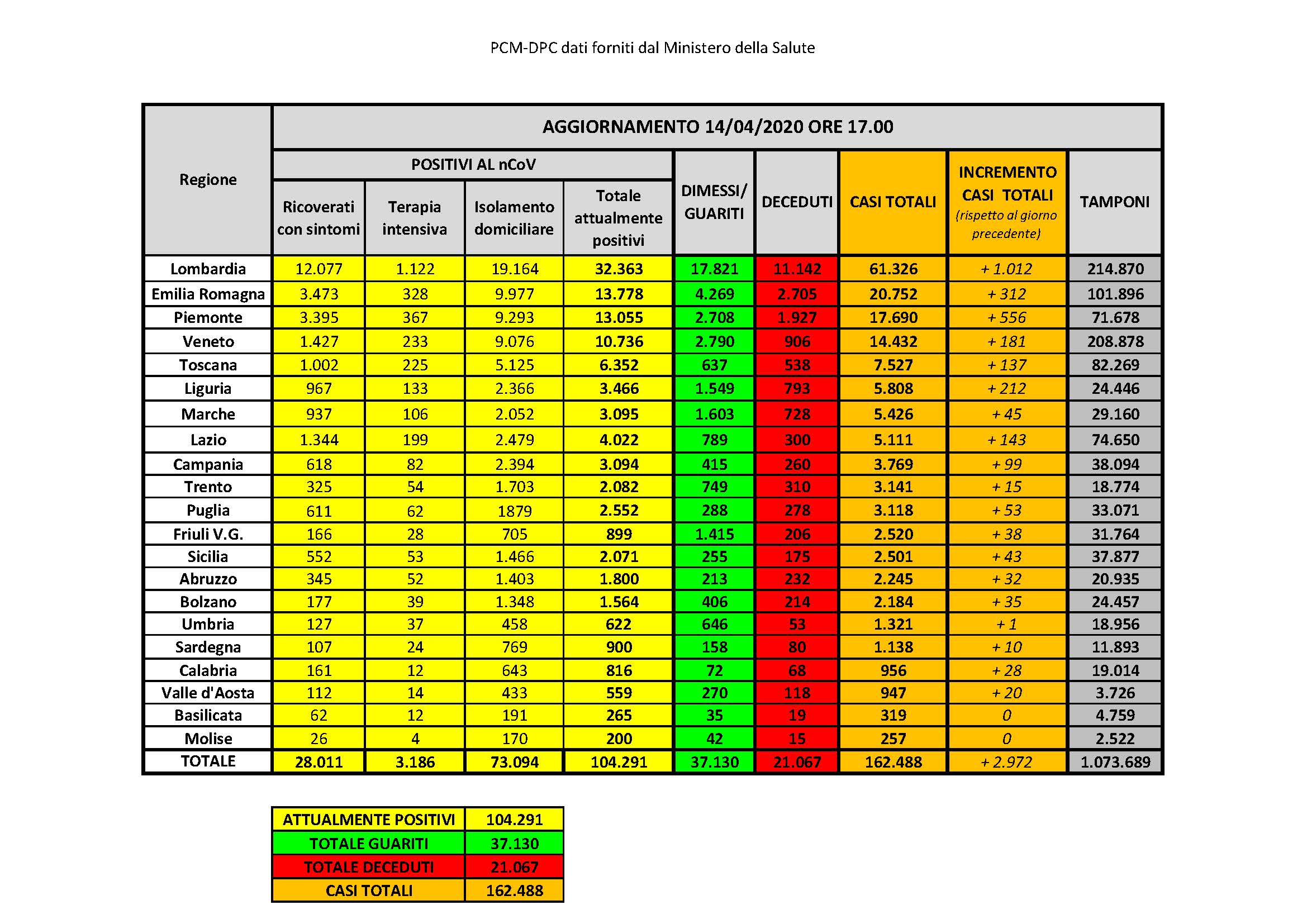I pazienti ricoverati in ospedale sono in tutto 131, 107 ricoverati con sintomi, 24 in terapia intensiva, mentre 769 sono le persone in isolamento domiciliare. Il totale dei positivi è di 900, 14 meno di ieri. Il dato progressivo dei casi positivi comprende 119 (+15) pazienti guariti, più altri 39 (+4) guariti clinicamente. Salgono a 80 i decessi (5 oggi).