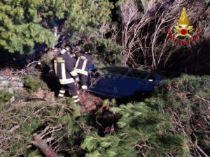 Volkswagen Golf, uscita di strada abbattendo il guard rail e rimasta incastrata fra