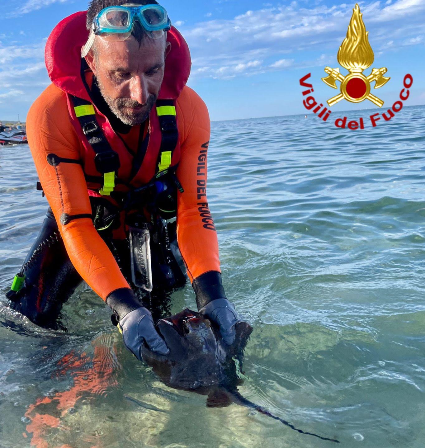 Salvataggio di una razza in evidente difficoltà nella spiaggia “Salamaghe”, a Budoni. A dare l’allarme ai vigili del fuoco sono stati alcuni bagnanti.