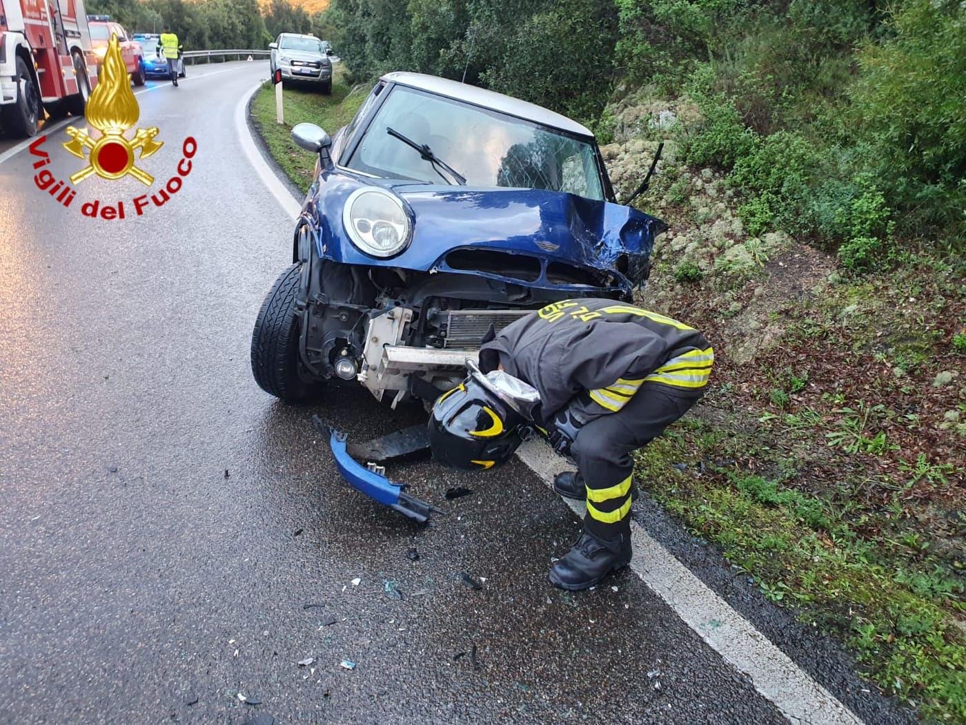 Incidente stradale sulla strada provinciale 127, in direzione di Telti. Per cause ancora in fase di accertamento due auto, una Fiat panda ed una Mini, si sono scontrate frontalmente riportando diversi danni.