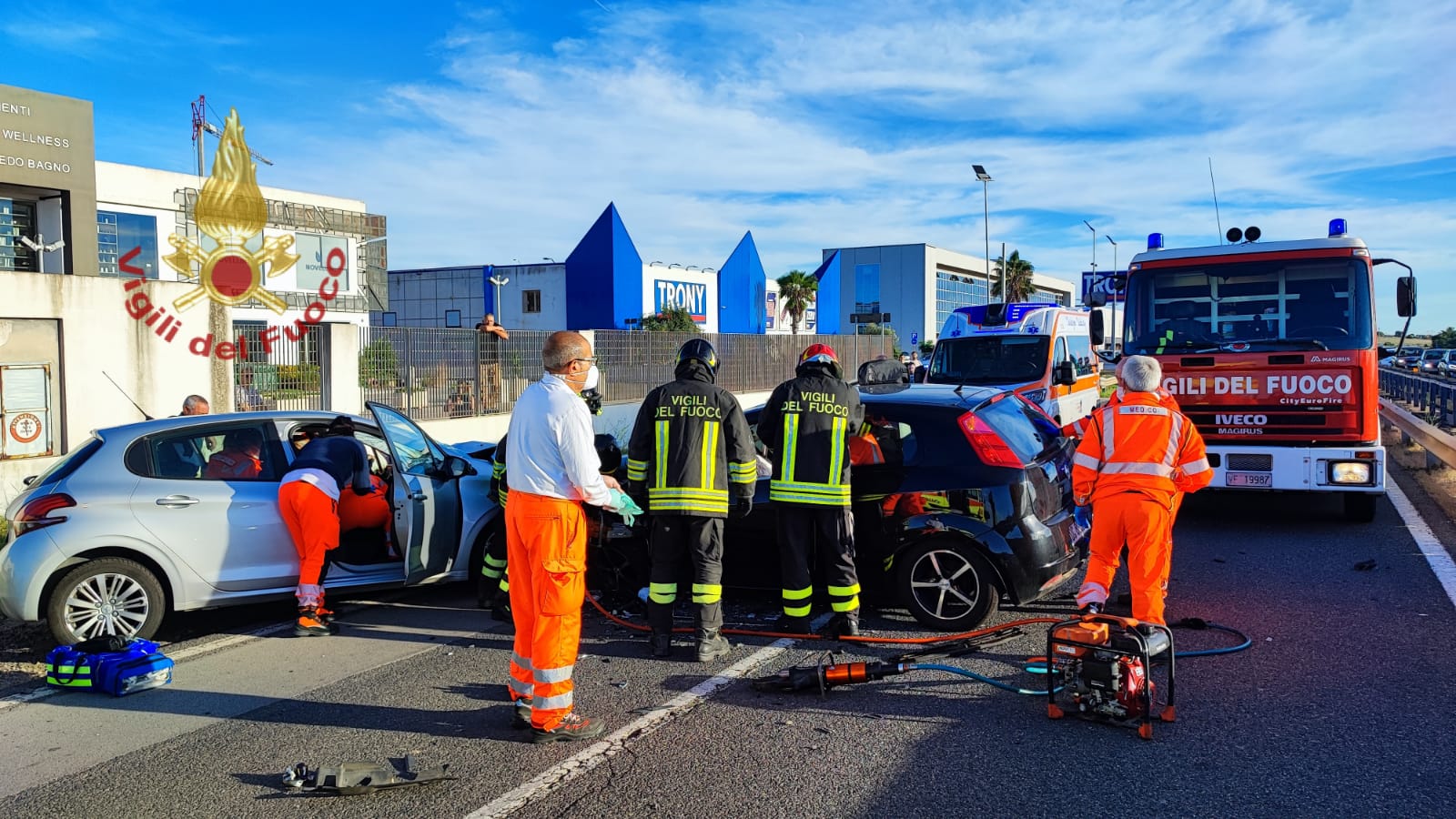 Incidente sulla strada complanare adiacente alla Statale 131, i vigili del fuoco estraggono due persone dai veicoli coinvolti
