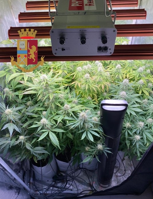 Il successivo controllo presso una vicina abitazione, di cui l’uomo disponeva delle chiavi, ha permesso agli agenti di rinvenire e sequestrare altri 120 grammi di marijuana e 12 piante di cannabis indica di altezza compresa tra i 100 e 150 cm collocate all’interno di un box attrezzato per la coltivazione indoor. Inoltre, è stata sequestrata la somma di 80 € ritenuta provento dell’illecita attività di spaccio con relativo materiale utile al confezionamento. Al termine delle formalità di rito, l’uomo è stato accompagnato presso il proprio domicilio in attesa dell’udienza di convalida.
