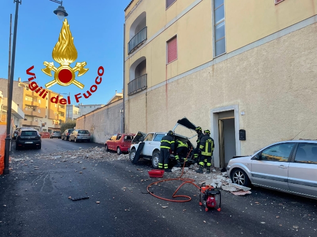 Il maltempo non ha risparmiato neanche Olbia. Intorno alle 6.00 di questa mattina i vigili del fuoco sono intervenuti in via Pisa, per il crollo di un’abbondante porzione di un cornicione a sbalzo. Tre auto sono state danneggiate dai macigni volati a terra da una decina di metri. Fortunatamente non si segnalano feriti. La via è stata chiusa e la squadra ha provveduto a mettere in sicurezza le auto e a bonificare l’area.