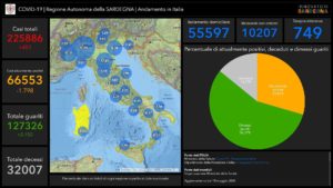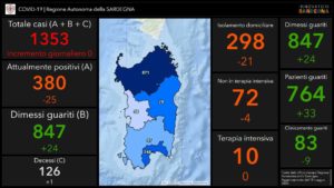 Nessun nuovo caso positivo al Covid-19 nelle ultime 24 ore in Sardegna su 1.138 tamponi eseguiti. Restano fermi a 1.353 i casi accertati dall’inizio dell’emergenza. In totale nell’Isola sono stati eseguiti 43.387 tamponi. I pazienti ricoverati in ospedale sono in tutto 82, dei quali 72 con sintomi e 10 in terapia intensiva, mentre 298 sono le persone in isolamento domiciliare. Gli attualmente positivi sono 380. Il totale dei pazienti dimessi/guariti è salito a 847. Nelle ultime 24 ore è stato registrato 1 decesso che porta il totale delle vittime a 126.