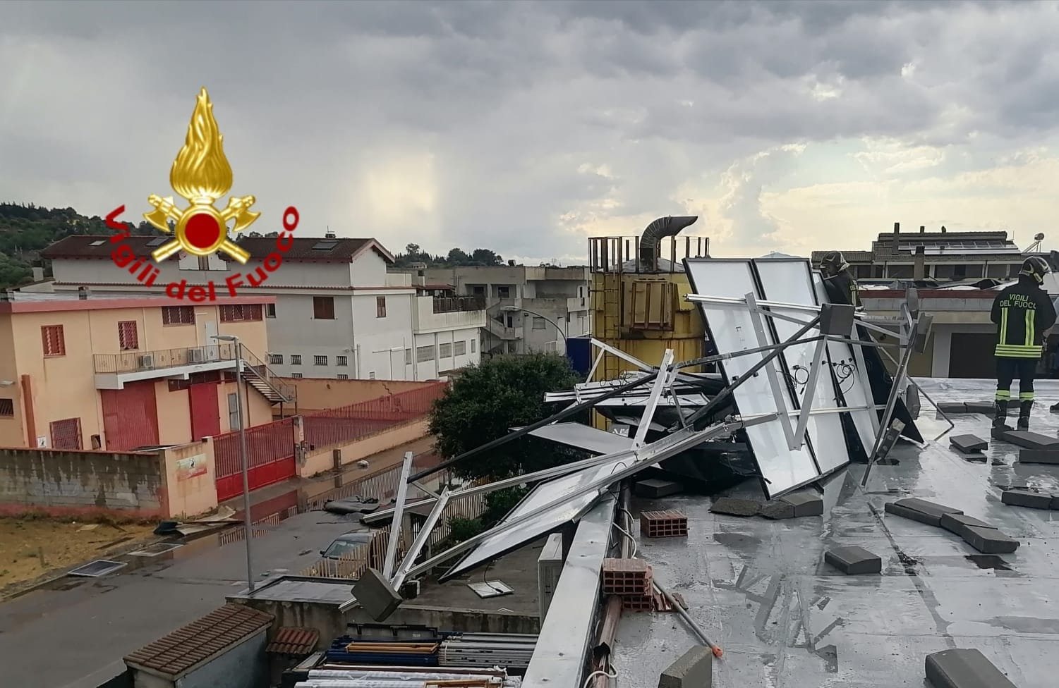 In via Don Milani, a Sestu, le raffiche di vento hanno strappato un impianto fotovoltaico dal tetto di un capannone, una parte è finita in strada, fortunatamente senza coinvolgere persone.