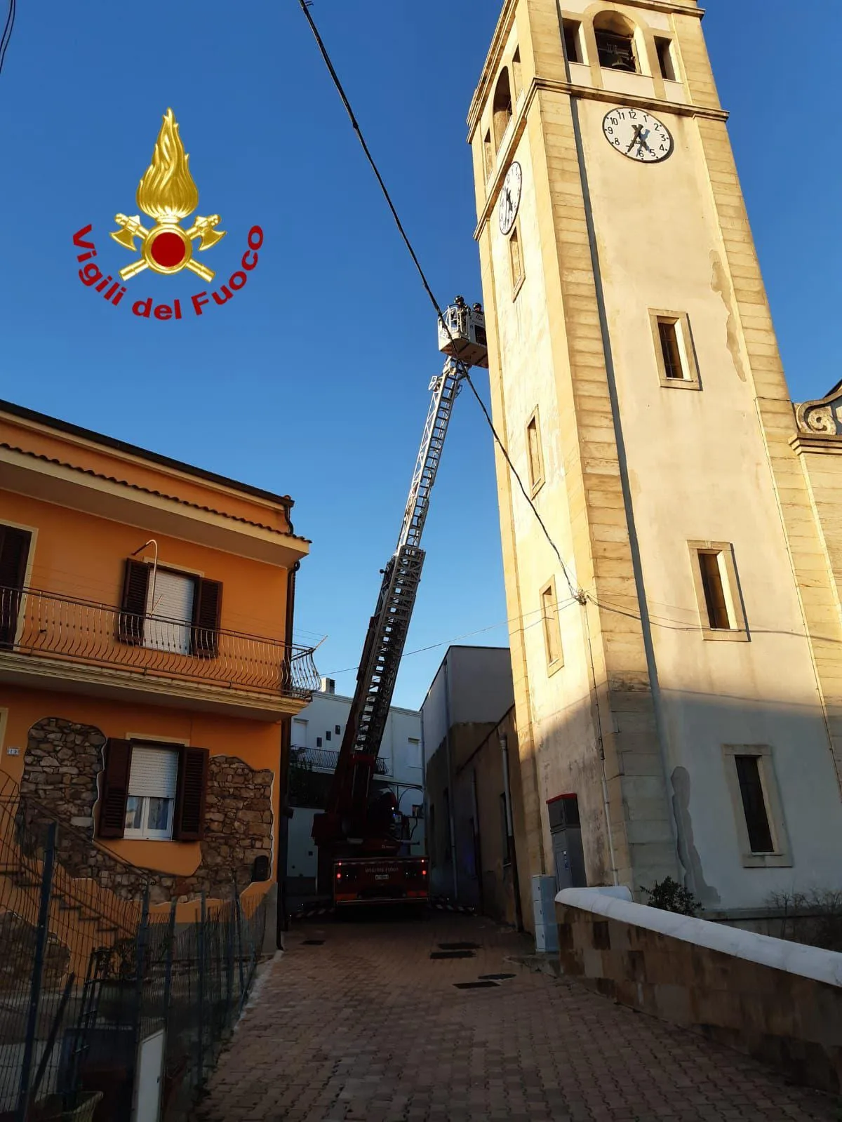 La squadra 11A del distaccamento dei vigili del fuoco di Tortoli è intervenuta Perdasdegogu per la rimozione della croce posta in cima alla torre campanaria della chiesa di San Pietro, a Perdasdefogu, che il forte vento aveva sradicato dalla sede nei giorni passati.