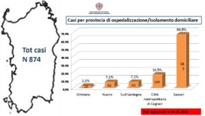 Sono 874 i casi di positività al Covid-19 riscontrati in Sardegna dall’inizio dell’emergenza. I ricoverati con sintomi sono 123, i pazienti in terapia intensiva 24, gli ospedalizzati complessivamente 147, 642 i pazienti in isolamento domiciliare.