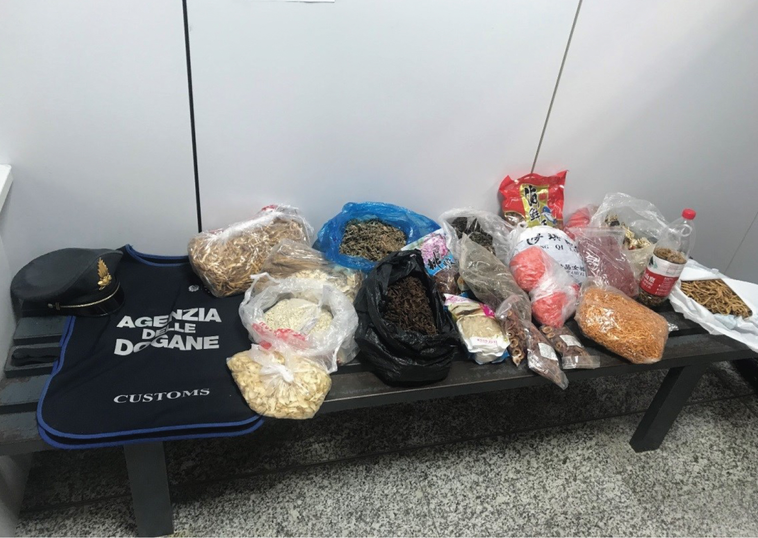 I prodotti erano nel bagaglio a mano di un passeggero di nazionalità cinese, proveniente dalla Repubblica Popolare Cinese, via Roma Fiumicino.