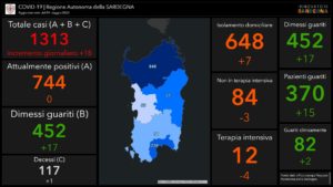 Sono 18 i nuovi casi positivi al Covid-19 riscontrati in Sardegna su 1.488 tamponi eseguiti. Il totale dei casi positivi sale così a 1.313 dall’inizio dell’emergenza. In totale nell’Isola sono stati eseguiti 26.242 tamponi. I pazienti ricoverati in ospedale sono in tutto 96, di cui 12 in terapia intensiva, mentre 648 sono le persone in isolamento domiciliare. Gli attualmente positivi sono 744. I dimessi/guariti sono 452. Il numero delle vittime sale a 117 (1 oggi).