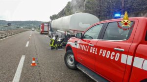 I vigili del fuoco del comando di Oristano sono intervenuti, questa mattina, sulla strada statale 131 Carlo Felice, per spegnere l’incendio che si è sviluppato in un’autocisterna che trasportava circa 36mila litri di gasolio. A dare l’allarme è stato lo stesso conducente. Gli operatori, anche grazie all’ausilio di un’autopompa serbatoio, sono riusciti a domare le fiamme. L’incendio causato probabilmente dal surriscaldamento dei freni di uno degli assi posteriori. Sul posto è intervenuta anche una pattuglia dei carabinieri.