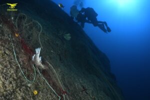Nel dossier fotografico allegato è visibile un esemplare di cernia catturato da una rete fantasma, testimonianza diretta della minaccia che questi attrezzi abbandonati rappresentano per la fauna marina.
