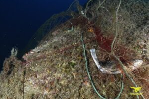 Nel dossier fotografico allegato è visibile un esemplare di cernia catturato da una rete fantasma, testimonianza diretta della minaccia che questi attrezzi abbandonati rappresentano per la fauna marina.