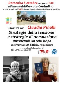Domenica 8 ottobre 2023, alle ore 11.00, in occasione del mensile Mercato contadino organizzato nella sede dell’ASCE a Selargius, lungo la SS 387 al km (di fonte all’Osservatorio Astronomico OAC), ci sarà un incontro con Claudia Pinelli, che dialogherà con l’antropologo Francesco Bachis sul tema “Strategie della tensione e strategie di persuasione”.