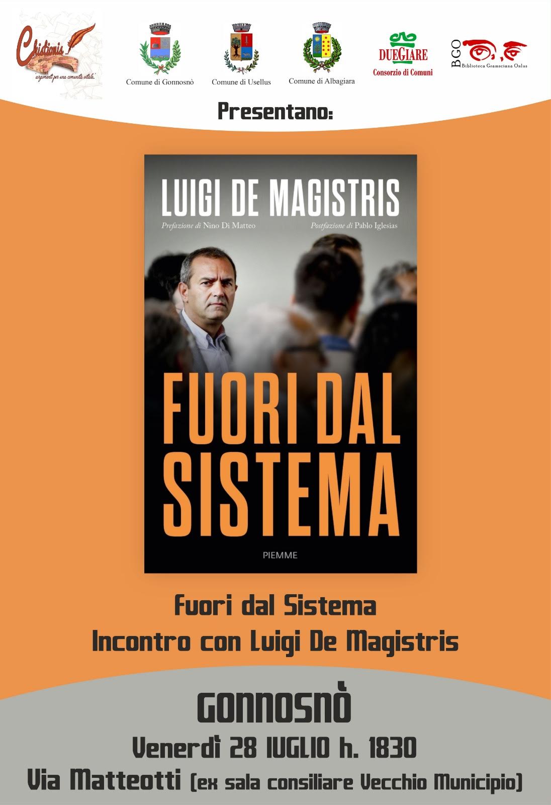Sarà presentato venerdì 28 luglio, alle 18.30, nell’ex sala consiliare del comune di Gonnosnò, il libro “Fuori dal sistema” di Luigi De Magistris. Si tratta del quarto appuntamento della rassegna itinerante “Chistionis”, organizzata dai comuni di Usellus, Gonnosnò ed Albagiara con il sostegno del Consorzio Turistico Due Giare e la direzione artistica della Biblioteca Gramsciana Onlus. Sarà Luigi Manias a dialogare con l’autore, mentre gli interventi saranno affidati a Marco Atzori.