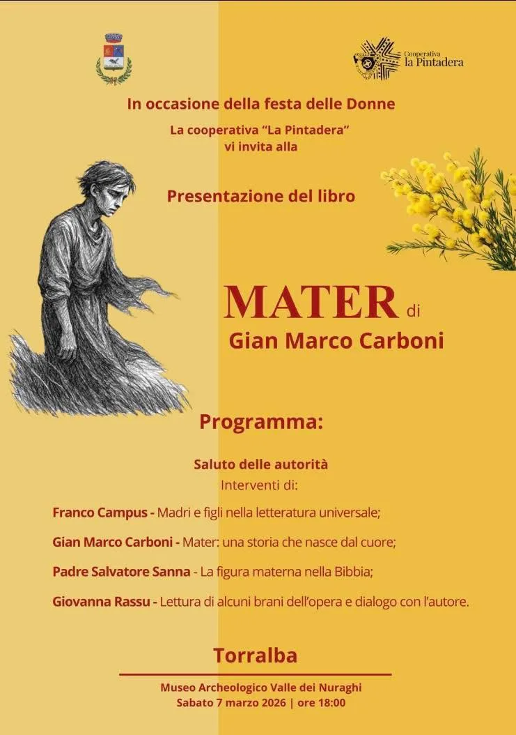 In concomitanza con la festa della donna, sarà presentato, sabato 7 marzo alle 18.00 nel Museo Archeologico di Torralba, il nuovo libro di Gian Marco Carboni, dal titolo “Mater”.