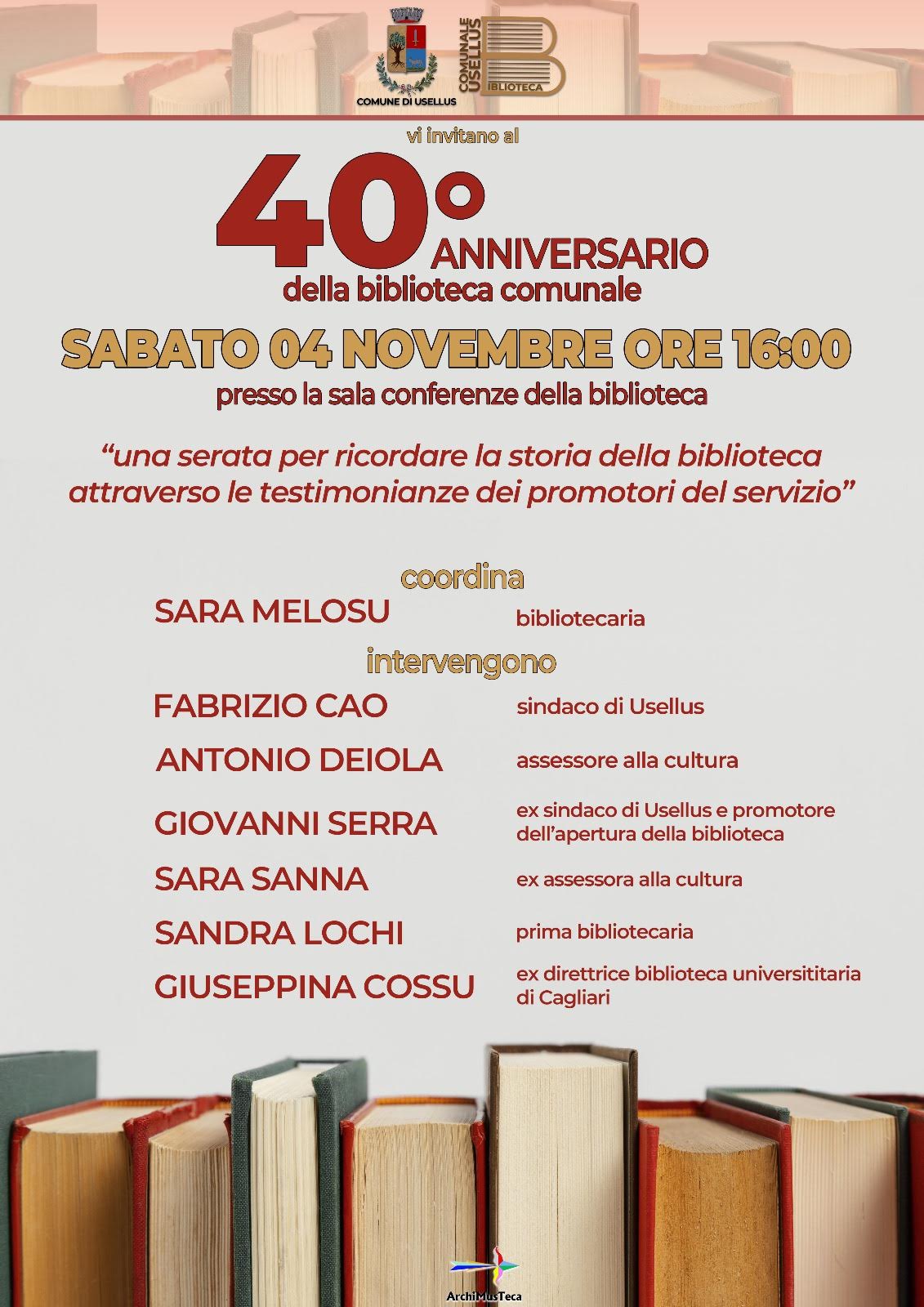 Altro fine settimana di appuntamenti in alcuni paesi del Consorzio Due Giare. A Usellus, sabato 4 novembre, saranno festeggiati i quarant’anni di vita della biblioteca comunale. In un incontro, che inizierà alle 16.00, coordinato dalla bibliotecaria Sara Melosu, andranno in scena le testimonianze dei promotori del servizio: il sindaco Fabrizio Casu, l’assessore comunale della cultura Antonio Deiola, l’ex sindaco e fautore dell’apertura della biblioteca Giovanni Serra, la prima bibliotecaria Sandra Lochi e l’ex direttrice della biblioteca universitaria di Cagliari Giuseppina Cossu.