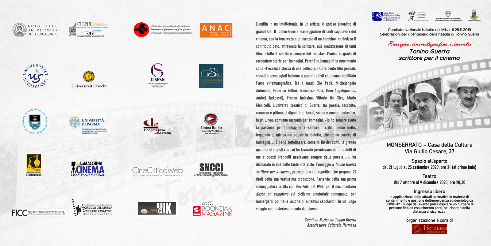 L’iniziativa è organizzata dal “Comitato Nazionale per le celebrazioni del centenario della nascita di Tonino Guerra” in sinergia con l’associazione Hermaea di Cagliari, il Comune di Monserrato e la Regione Autonoma della Sardegna con la collaborazione di diverse Università, Centri studi, associazioni culturali e media partners.