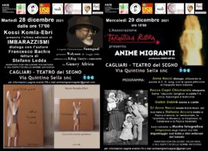 Mercoledì 29 dicembre, alle ore 18.00 è in programma lo spettacolo “Anime migranti” (Teatro del Segno, ore 18.00), portato in scena dalla compagnia pugliese “Tarantula Rubra”, che prende il nome dallo pseudonimo con cui la presidente Anna Nacci, dal 1999, conduce una trasmissione radiofonica per “Radio Onda Rossa” di Roma. Per motivi di salute, proprio la Nacci non potrà proporre il suo monologo. La serata si aprirà con la proiezione di un documentario sugli emigrati italiani negli Stati Uniti d’America. Rocco Capri Chiumarulo interpreterà Dante, Tabucchi, Senghon, e poi canterà F.G. Lorca, Kypourgos e Malicorse. Il cantante del Burkina Faso Gabin Dabiré (che in passato ha lavorato anche con Andrea Parodi e le Balentes) suonerà e canterà un brano del suo Paese. Stefania Ancora, infine, ballerà la Pizzica d’amore, la Tammurriata, la Tarantella, la Moresca, la Carpinese, la Calabrese e la Pizzica Tarantata.