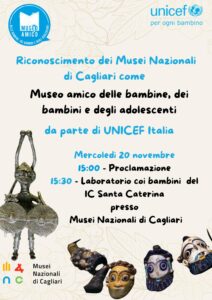 Il prossimo 20 novembre 2024, in occasione della Giornata mondiale dei diritti dell’infanzia, si svolgerà l’iniziativa per il riconoscimento dei Musei Nazionali di Cagliari come “Museo Amico delle bambine, dei bambini e degli adolescenti” da parte dell’UNICEF Italia, alla presenza della responsabile dell’Ufficio Didattica, Educazione e Ricerca dei Musei Manuela Puddu e del presidente del Comitato provinciale per l’UNICEF di Cagliari Paolo Ligas.