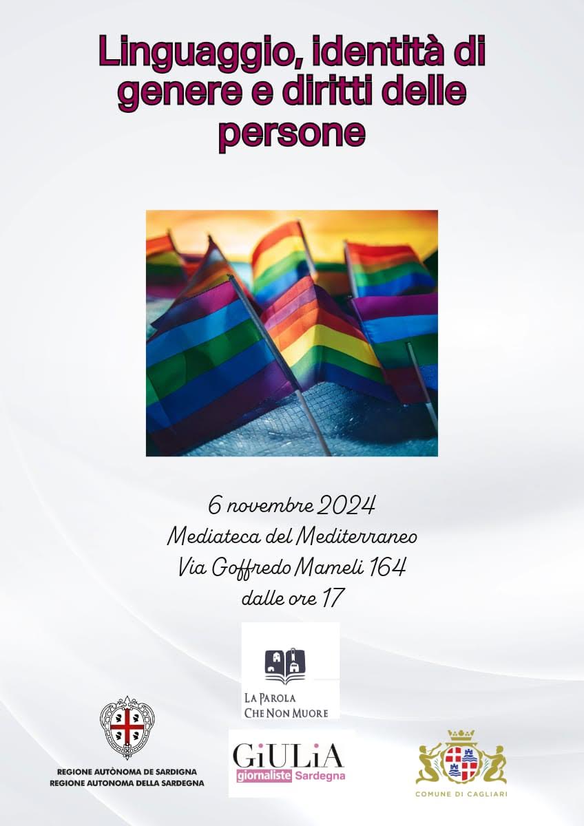 Il 6 novembre, alla Mediateca del Mediterraneo (MEM) di Cagliari, dalle 17.00 alle 19.00 si svolgerà il convegno di alto valore culturale “Linguaggio, identità di genere, diritti delle persone” ideato e organizzato dall’associazione “La Parola che non muore” in collaborazione con l’associazione Giulia Giornaliste Sardegna. Un incontro a più voci sul tema del contrasto all’odio, al disprezzo e a ogni forma di discriminazione nei confronti delle donne, delle persone omosessuali e trans e delle minoranze etniche.