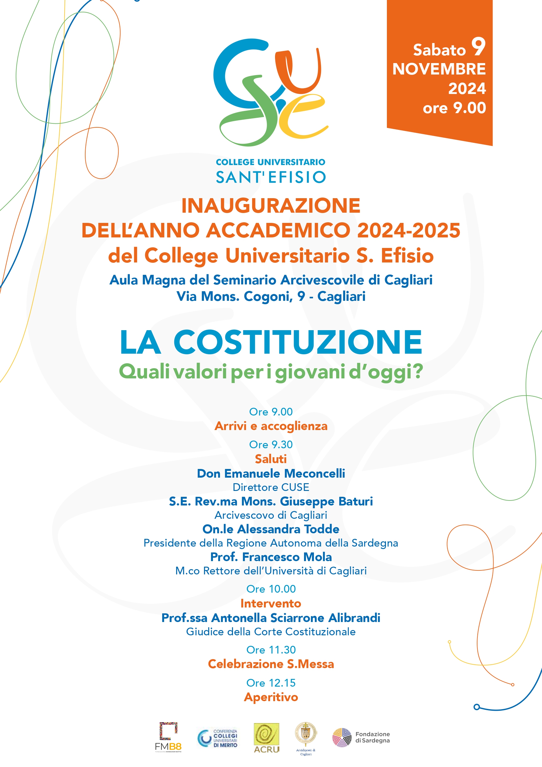 Il College Universitario Sant’ Efisio inaugura il nuovo anno accademico 2024-2025 con un evento che si terrà nell’Aula magna del Seminario arcivescovile di Cagliari (via monsignor Giovanni Cogoni, 9). L’iniziativa, prevista per sabato 9 novembre 2024, a partire dalle 9.00, affronterà un tema di particolare rilevanza per la società contemporanea “La Costituzione. Quali valori per i giovani d’oggi?”