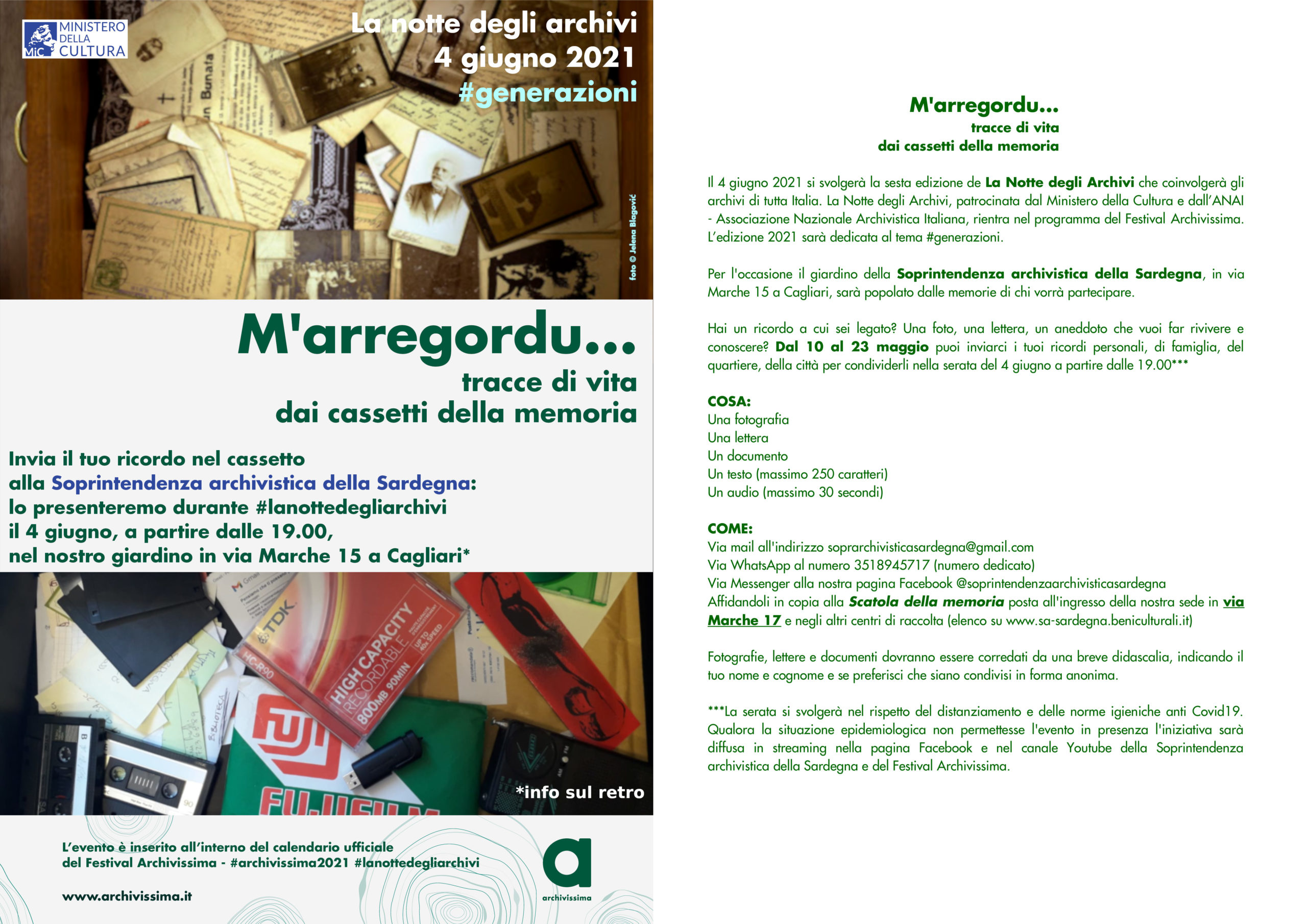 La Soprintendenza archivistica della Sardegna aderisce con l’iniziativa denominata M’arregordu. Tracce di vita dai cassetti della memoria, con l’obiettivo di creare una raccolta di ricordi di comunità attraverso foto, documenti, audio o brevi testi liberamente scelti e donati da tutti coloro che desiderano partecipare, purché collegabili al tema del festival #generazioni.