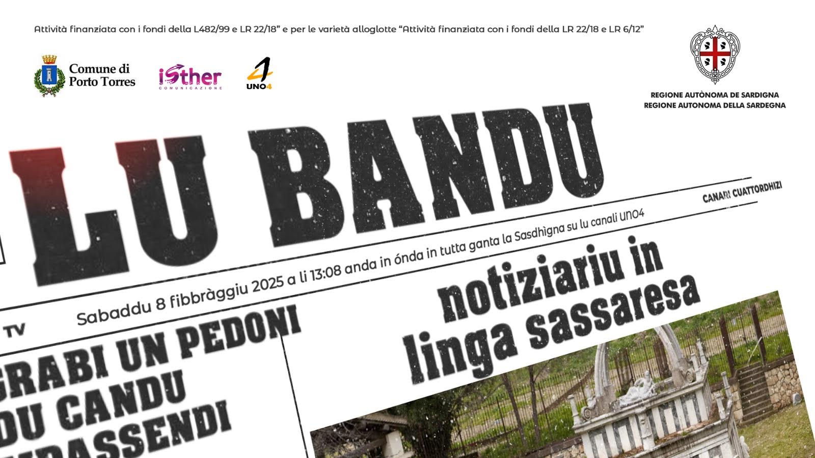 “Lu Bandu – Notziariu in linga Sassaresa-Turritana” è il progetto che il comune di Porto Torres realizzerà grazie al finanziamento regionale da 10 mila euro ottenuto per aver partecipato al bando “TuLiS- Tutela lingue Sarde”. Per realizzarlo, è stato selezionato l’operatore Isther Srl che si occuperà della redazione e della messa in onda di un breve notiziario di almeno 8 puntate sull’emittente UNO4, al canale 14 del digitale terrestre. Dopo quella pilota, la prima puntata è in programma sabato 8 febbraio 2025, alle ore 13.08.