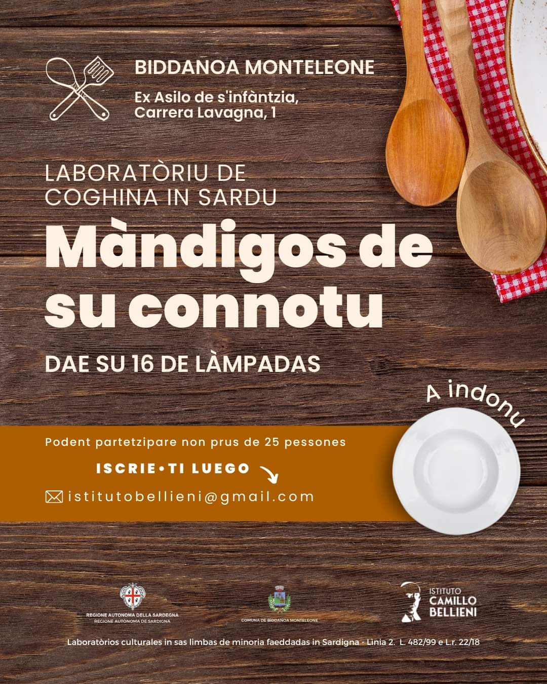 Tra i laboratori più attesi, a partire da giovedì 16 giugno ci sarà il “Laboratòriu de coghina in sardu. Màndigos de su connotu”, un corso di cucina sarda, gratuito e in presenza, che si svolgerà dalle 15.30 alle 19.00, nei locali dell’ex Asilo dell’infanzia, in via Lavagna 1 a Villanova Monteleone. La docenza è affidata a Lucia Sechi e il ruolo di tutor a Maria Leonarda Correddu. L’invito degli organizzatori è quello di affrettarsi nelle iscrizioni, in quanto il tetto di partecipazione prevede un massimo di venticinque iscritti.