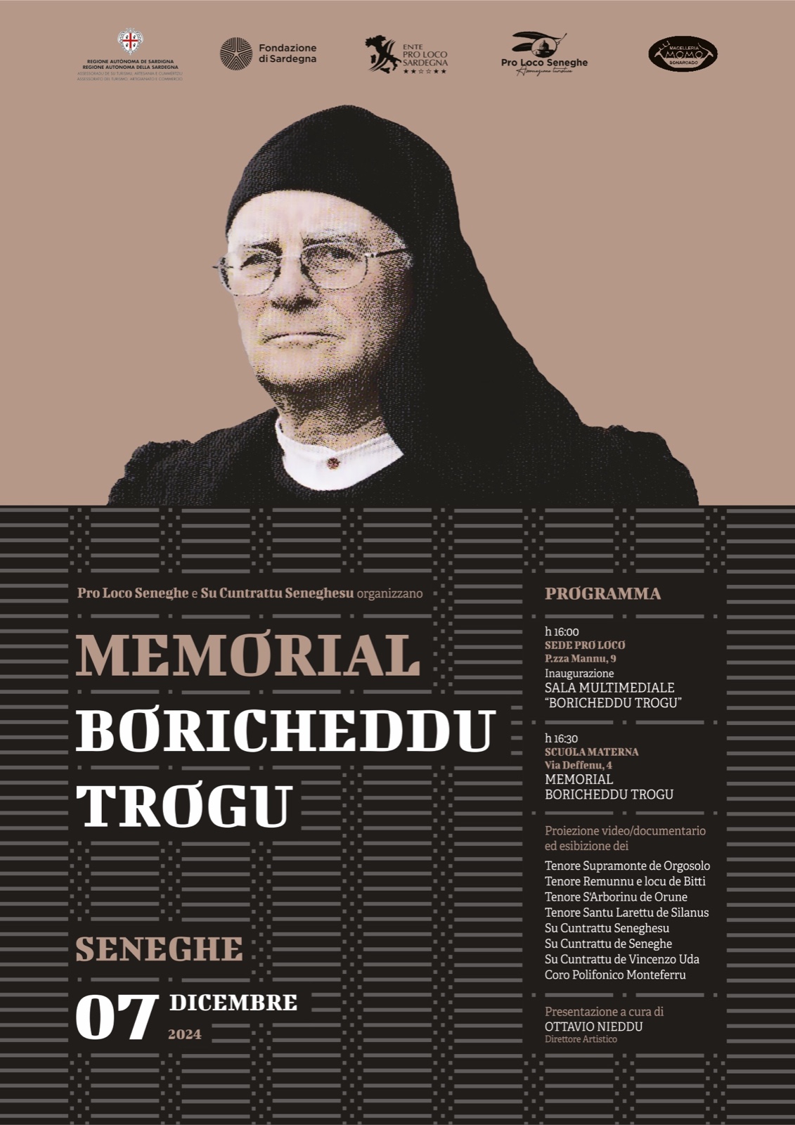 Grande appuntamento culturale sabato 7 dicembre a Seneghe che, sabato 7 dicembre, ricorderà la straordinaria figura di Boricheddu Trogu. L’evento, organizzato dalla Pro Loco e da Su Cuntrattu Seneghesu, partirà alle 16.00, proprio nella sede della Pro loco, con l’inaugurazione della sala multimediale “Boricheddu Trogu”. Alle 16.30 ci si sposterà nella scuola materna per il primo memorial Boricheddu Trogu al quale prenderanno parte i tenores “Supramonte” di Orgosolo, “Remunnu e Locu” di Bitti, “S’Arborinu” di Orune, “Santu Larettu” di Silanus, “Su Cuntrattu Seneghesu, “Su Cuntrattu de Seneghe”, “Su Cuntrattu de Vincenzo Uda” e il coro polifonico “Monteferru”. La serata sarà presentata dal direttore artistico, Ottavio Nieddu.