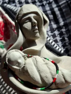 “Amargura”, un termine sardo che significa amarezza, ripreso dal titolo del brano e dell’album della cantante Elena Ledda del 2025, raffigura una madre immersa per metà in una pozza d’acqua, resa attraverso il frammento informe di uno specchio: la figura emerge dall’acqua, riflettendo in essa la sua immagine. La madre tiene tra le braccia la sua vita spezzata. Si tratta di un’immagine potente ed evocativa che richiama il dolore universale delle madri vittime di violenza nel corso dei conflitti e nei troppi teatri di guerra disseminati nel mondo.
