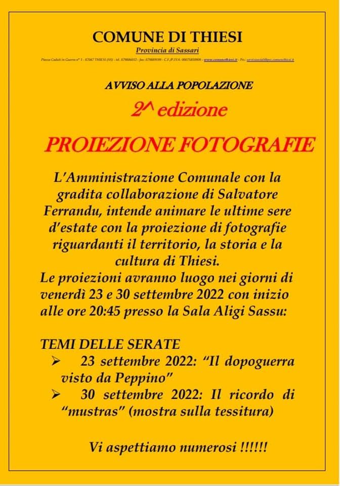 Saranno rispettivamente “Il dopoguerra visto da Peppino”, in programma venerdì 23 settembre, ed ”Il ricordo di Mustras-mostra sulla tessitura”, in agenda il 30 settembre, i temi della seconda edizione delle proiezioni di fotografie organizzate dall’amministrazione comunale di Thiesi in collaborazione con il professor Salvatore Ferrandu. Entrambi gli appuntamenti si terranno alle 20.45 nella sala Aligi Sassu.